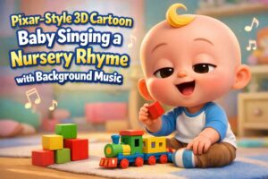 “Pixar-style 3D cartoon of a cute baby with a big round head, expressive eyes, and a yellow curl, wearing a white & blue shirt and light brown pants, happily playing with colorful blocks and a toy train. Baby is softly singing a nursery rhyme with gentle lip movement, natural blinking, slight head and hand motions, while soft background music plays like a real song. Bright pastel kids room, warm lighting, kid-friendly, very realistic.”